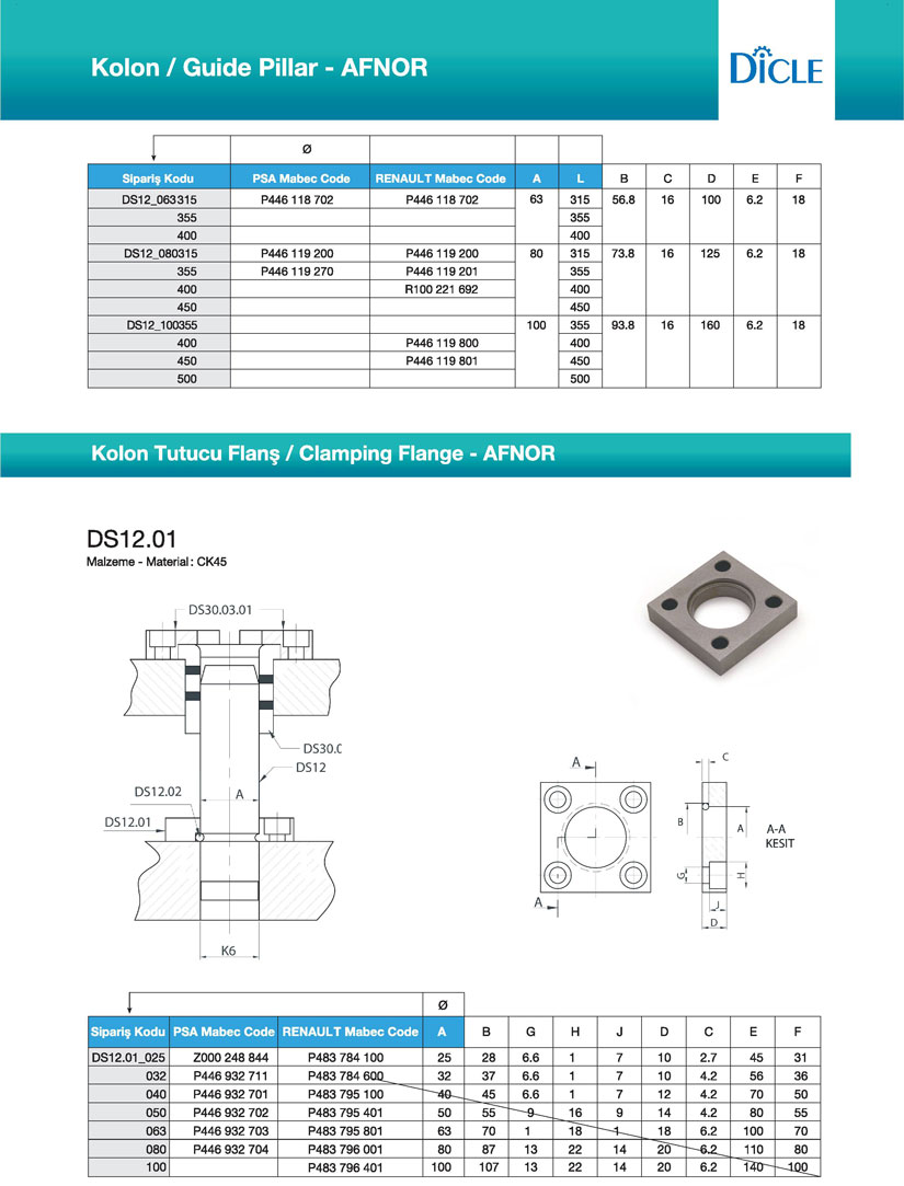 Pres Kalıp Setleri / Standart Ölçü Tablosu